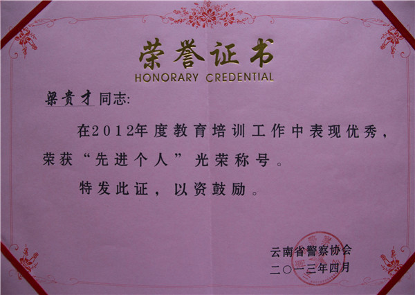 梁贵才先进个人荣誉证书